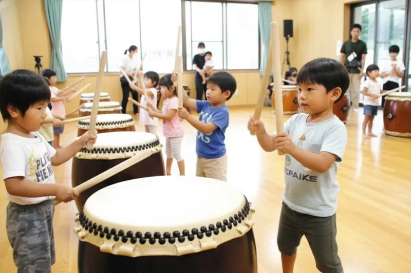 - 太鼓を両手で叩く活動から始め、同じ動きでの両手協調から練習する